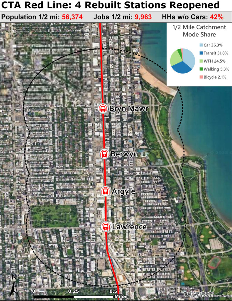 These stations have by far the best land use and highest population density of all the new rail projects opened this year. While the close stop spacing on the North Side Main Line and temporary Argyle station means ultimately were not missed too badly during their prolonged closure, the abundance of car-free households and nearby walkable neighborhoods far exceeding the vast majority of the country is an example of why Chicago needs and deserves better transit in the core; there are many dense neighborhoods that should be in line for new rail transit instead of just rebuilt stations. Sadly CTA is committed to extending the Red Line further south into sprawling low density neighborhoods on the far South Side due to prior promises going back decades and lack of expert leadership. With new funding passed by the state that starved off the impending fiscal cliff and provides local transit agencies with greater financial flexibility in the future, CTA and other agencies should commit to improving transit in the urban core beyond simply throwing improved service hours at the problem without improving the underlying inefficient operations of the system.