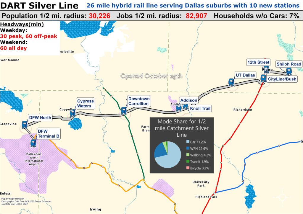 The Dallas Area Rapid Transit (DART) Silver Line, a 26-mile Diesel Multiple Unit (DMU) regional rail corridor, commenced service on October 25, 2025 after years of planning and construction. Operating between Shiloh Road in Plano and DFW International Airport’s Terminal B, the Silver Line traverses seven cities—Plano, Richardson, Dallas, Addison, Carrollton, Coppell, and Grapevine—across Collin, Dallas, and Tarrant counties, with 10 new stations integrated into the broader transit network. (DART)