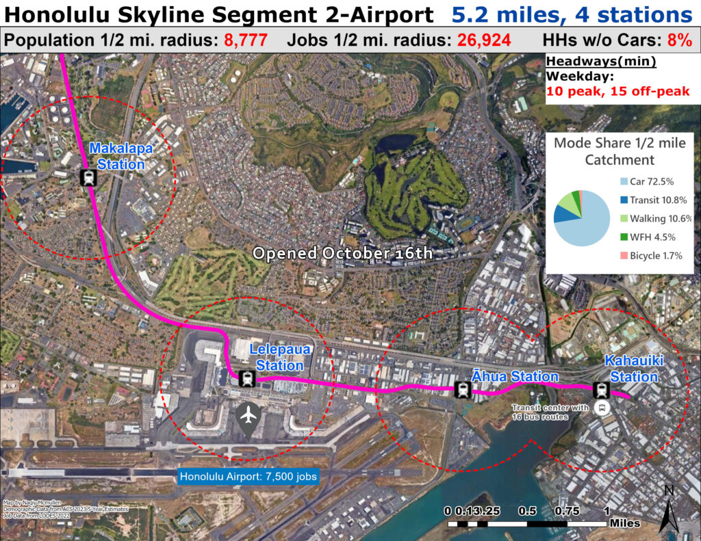 Honolulu’s Skyline Segment 2 opened on October 16, 2025, expanding Hawaii’s historic rail system by five additional miles and four new stations, extending passenger service from East Kapolei to Middle Street with extended operating hours from 4:00 a.m. to 10:30 p.m. daily. The segment connects critical employment hubs including Joint Base Pearl Harbor-Hickam, Daniel K. Inouye International Airport, and the Māpunapuna industrial area. Technically, Skyline represents a groundbreaking achievement as the first fully autonomous, urban light railway system in the United States, operating at Grade of Automation 4 with fully driverless trains. The system utilizes 750 V DC third-rail electrification with automated train control enabling maximum speeds of 55 mph, averaging about 30 mph along the elevated guideway. The fleet consists of 20 four-car Hitachi Rail trainsets, each with capacity for 800 passengers, featuring air conditioning, Wi-Fi, bicycle and surfboard storage, and platform screen doors for enhanced safety. Trains arrive every 10 minutes throughout the day, with the system projected to grow from approximately 3,900 daily riders currently to 25,000 with Segment 2, and ultimately 85,000 daily riders when Segment 3 opens to downtown Honolulu in 2031.