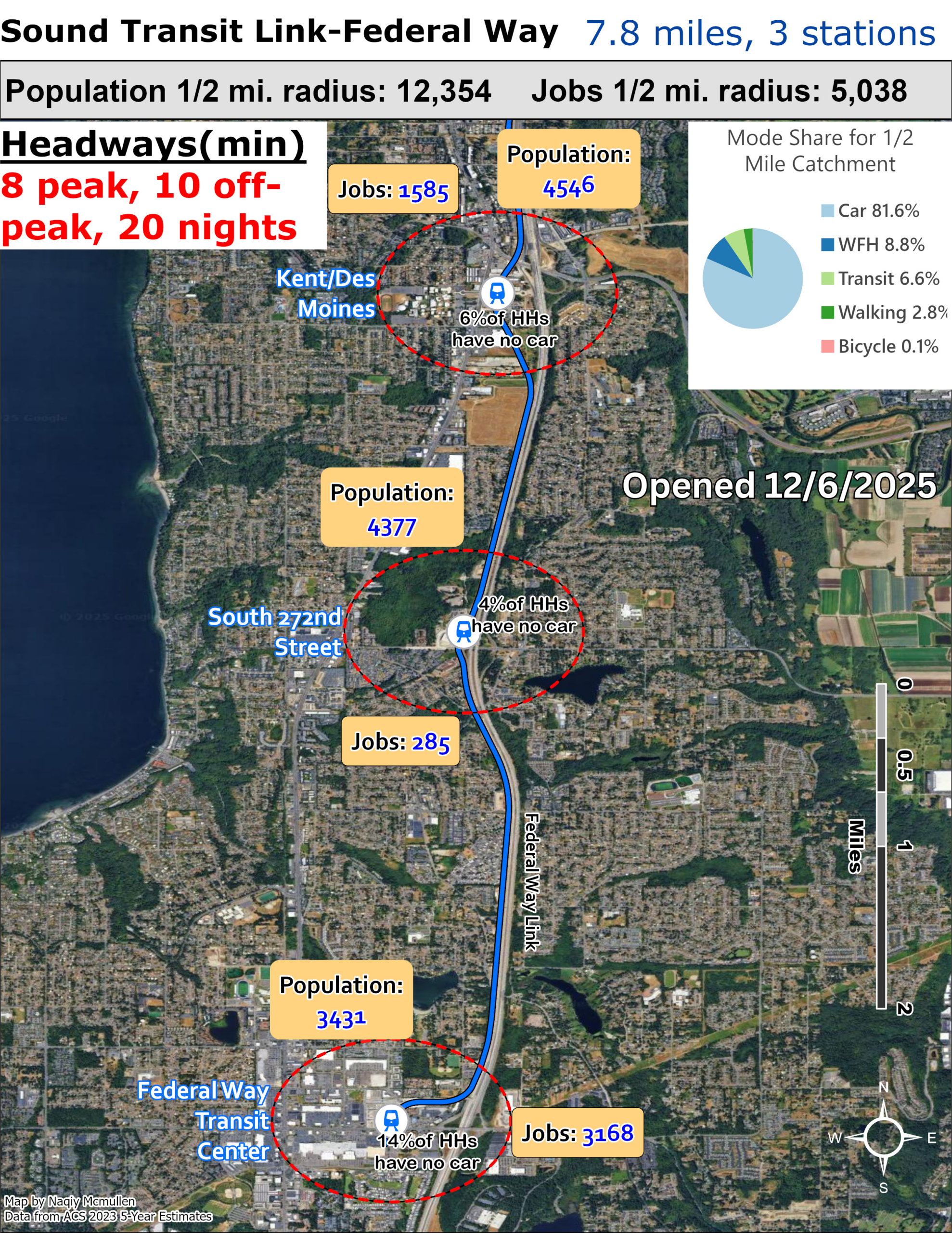 Sound Transit’s Federal Way Link Extension opened to the public on December 6, 2025, marking a transformative moment for South King County’s connectivity to the broader Seattle region. The $2.5 billion project adds 7.8 miles of mostly elevated track Sound Transit extending the 1 Line from Angle Lake Station southward to Federal Way, with three new stations at Kent Des Moines (near Highline College), Star Lake, and Federal Way Downtown. The extension, which was delayed two years due to unstable soil conditions requiring construction of an elevated bridge, ultimately opened ahead of its revised 2026 schedule thanks to streamlined testing processes. Now Federal Way residents can reach Sea-Tac Airport in just 16 minutes and downtown Seattle in approximately 50 minutes, with trains running every eight minutes during peak hours.